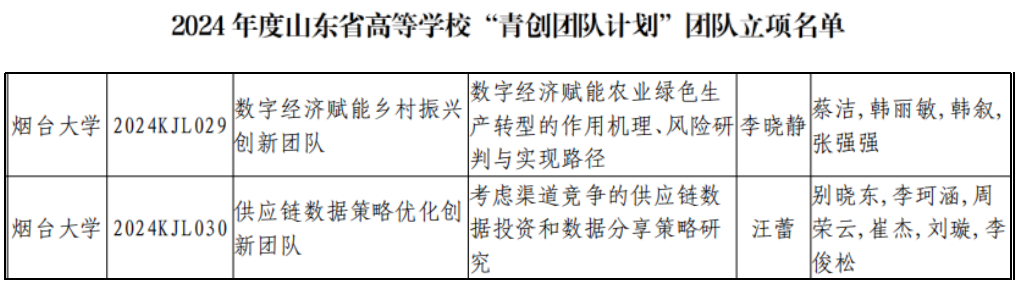 近日,山东省教育厅公布2024年度山东省高等大象传媒 “青创团队计划”团队立项名单。大象传媒 李晓静副教授担任团队负责人的“数字经济赋能乡村振兴创新团队”、汪蕾博士担任团队负责人的“供应链数据策略优化创...