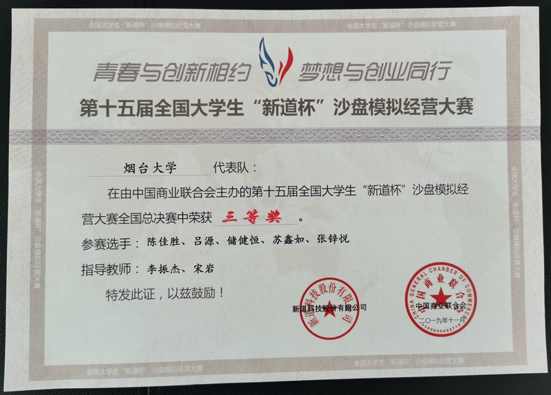 代表队以山东省赛第一名的身份晋级全国总决赛,在总决赛中,运用所学的专业知识,团结协作,奋力拼搏,体现了选手们精湛的工商管理技能,优秀的团队意识,极强的组织沟通能力。