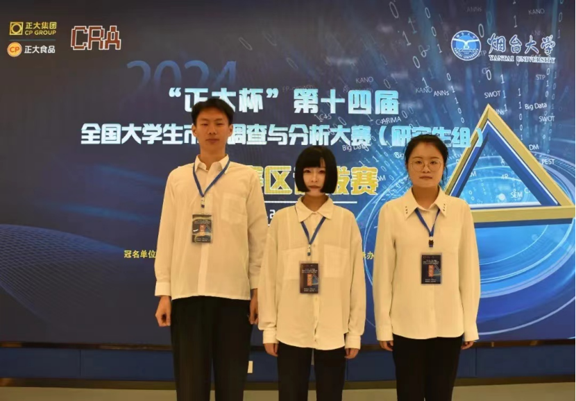 本科生团队作品《品鸡肉之韵,享正大之名——山东市场鸡肉熟调产品的市场及消费渠道研究》(队长:王聪聪)获得一等奖,《抖韵映食光,团趣启味蕾——山东省居民抖音餐饮团购消费行为研究》(队长:张帆)获得二等奖,《“心驰神往,游乐无穷”消费者外出旅游心理动机调查研究》(队长:蔡会芹)和《“饽”大精深,助“文”远航——非遗文化赋能地方经济发展路径调研》(队长:姜晶芮)获三等奖。