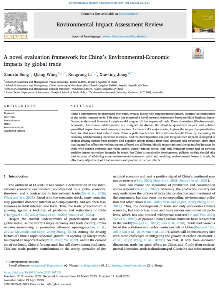 宋晓欣博士在国际环境科学类别期刊《Environmental Impact Assessment Review》(中科院一区TOP,IF:7.9)上发表题为“A novel evaluation framework for China’s Environmental-Economic impacts by global trade”的高水平论文,宋晓欣博士为本文的第一作者,大象传媒