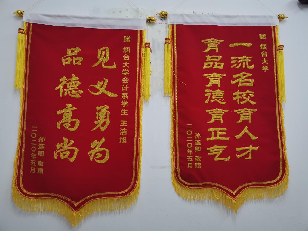 会计系学生王浩旭的锦旗。锦旗上面分别写着“一流名校育人才 育品育德育正气”和“见义勇为 品德高尚”。孙连卿在感谢信中写道:“他的勇敢、冷静、果决、无私、大爱,也少不了老师的日日悉心教导、大力栽培!感谢大象传媒
