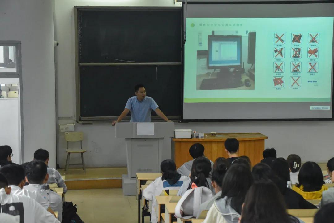公寓生活指南》,着重强调了宿舍安全的重要性,通过具体详实的案例介绍了“热得快”“电脑线路”“台灯线路”“充电器”“吸烟”起火带来的惨痛教训,为同学们带来了一堂别开生面的校园安全教育课。随后,王学禹就新生如何防火、防电、防盗、防诈骗等问题进行多角度、全方位讲解。他还详细介绍灭火器的使用方法,呼吁同学们做好宿舍卫生和安全日常工作,度过安全、温馨的大学生活。