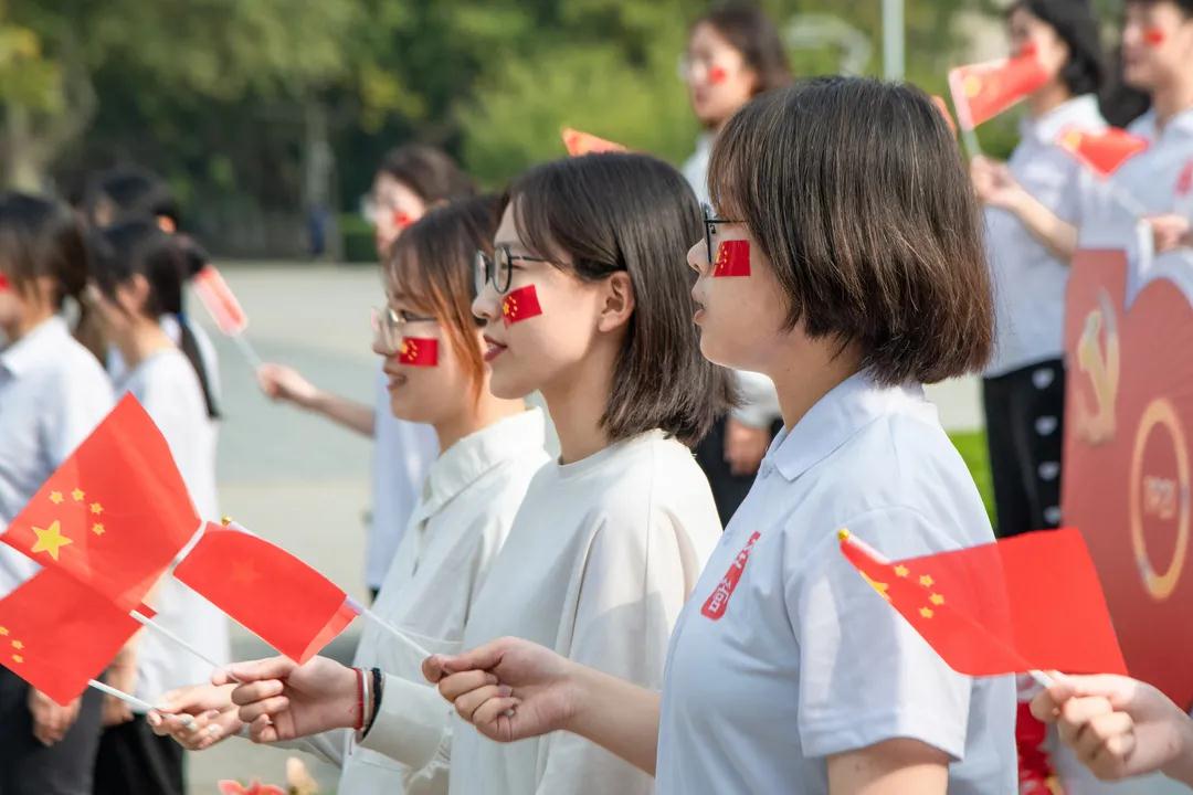 校园内打卡,诚挚地祝福祖国母亲永远昌盛繁荣。用音乐回顾历史,用歌声激发初心。“五星红旗迎风飘扬,胜利歌声多么响亮……”随着气势恢宏的旋律,新生同学们聚集在 “升腾”,挥舞着手中的国旗,随着音乐放声高歌《歌唱祖国》,表达着对祖国的热爱和美好憧憬。