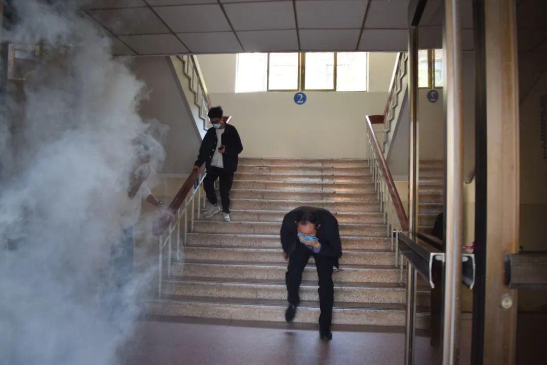 安全员在发现文科馆一层烟雾较大后,立即启动应急预案,模拟拨打“119”报警并组织撤离。随着紧急疏散警报的拉响,各层疏散员快速喊话组织,楼内师生在指引下,用湿毛巾捂住口鼻,弯腰靠墙,迅速有序地从安全通道逃生,到升腾广场的疏散集合点,顺利完成了应急疏散环节。整个疏散过程紧张而有序,所有师生均撤离到了指定位置,未发生任何混乱和意外,达到了预期效果。