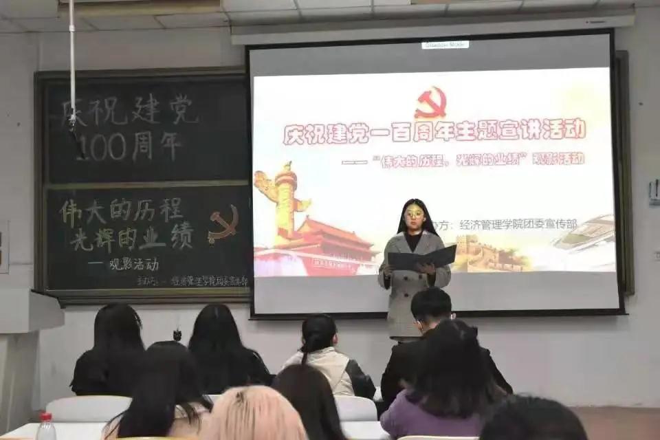 组织学生观看《建党伟业》《国家相册》等红色影片,在观影中触摸风云激荡的历史体温,接受思想洗礼、淬炼政治坚定;艺术团组织开展“欢歌新时代、颂歌献给党”文艺汇演活动,在唱响《没有共产党就没有新中国》《走向复兴》《东方红》等歌曲中重温经典旋律,讴歌时代精神,激发昂扬斗志,鼓劲拼搏热情。舞蹈团的同学们用优美的舞姿和创意的编排共同演绎红歌《一条大河》,表达不忘初心、继往开来的使命和决心,展现当代青年奋进新征程、担当新作为、焕发新气象的精神风貌。